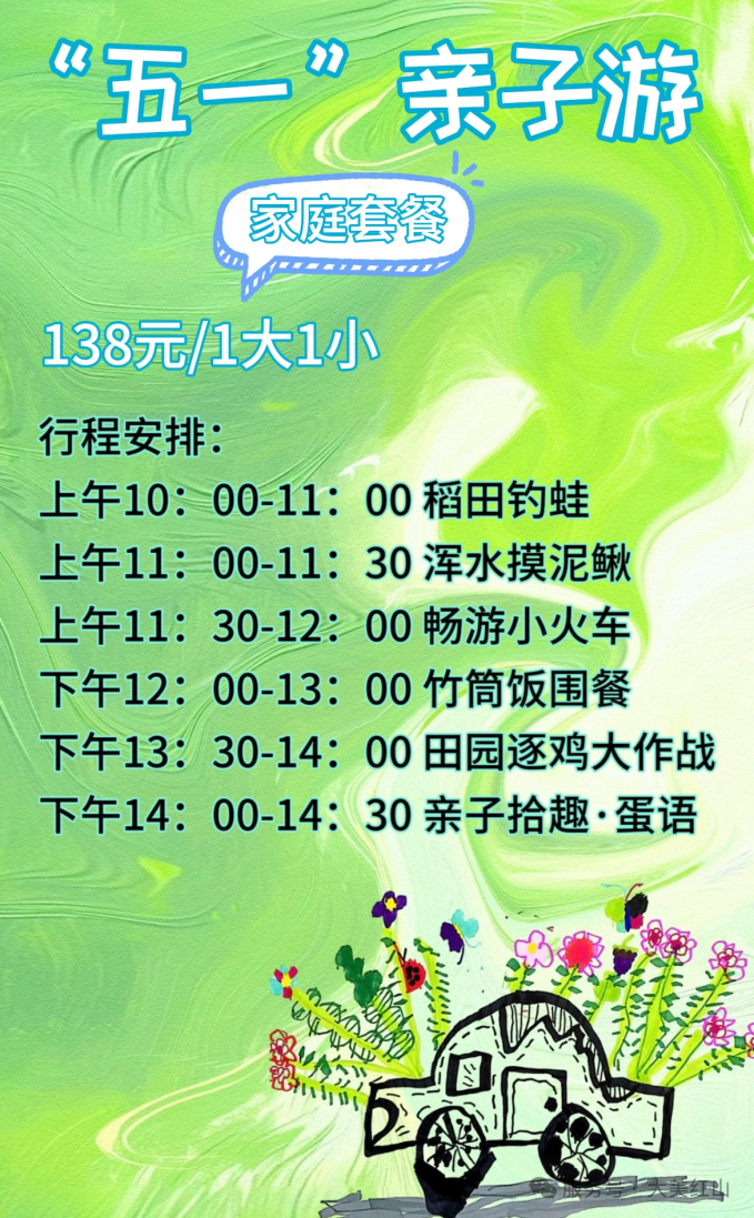 红山村钓蛙乐园→浑水摸泥鳅→萌鸡逗趣→小火车之旅→柴火竹筒饭