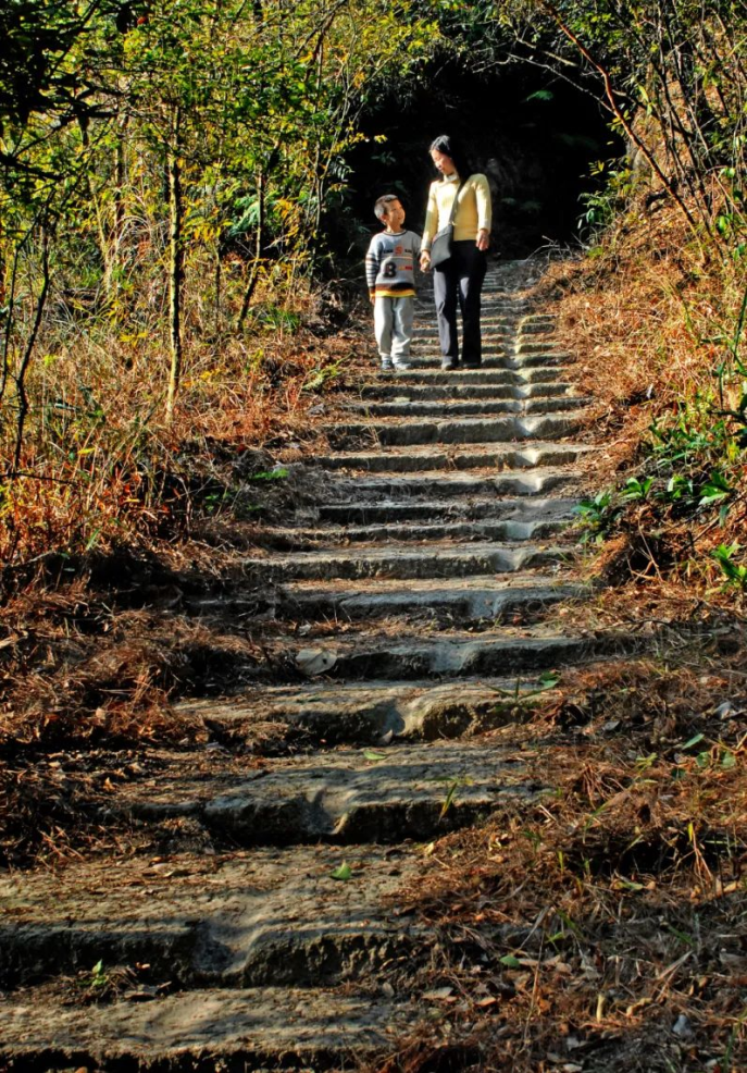 一条狭窄的小道沿着陡峭山坡,在寂静的林间蜿蜒而行,拾级而上的麻石步阶,与印刻其上的那一道,用时间辗成的深深的鸡公车辙痕,无声地诉说着岁月的沧桑,也见证着历史的变迁。这就是百步梯遗址。