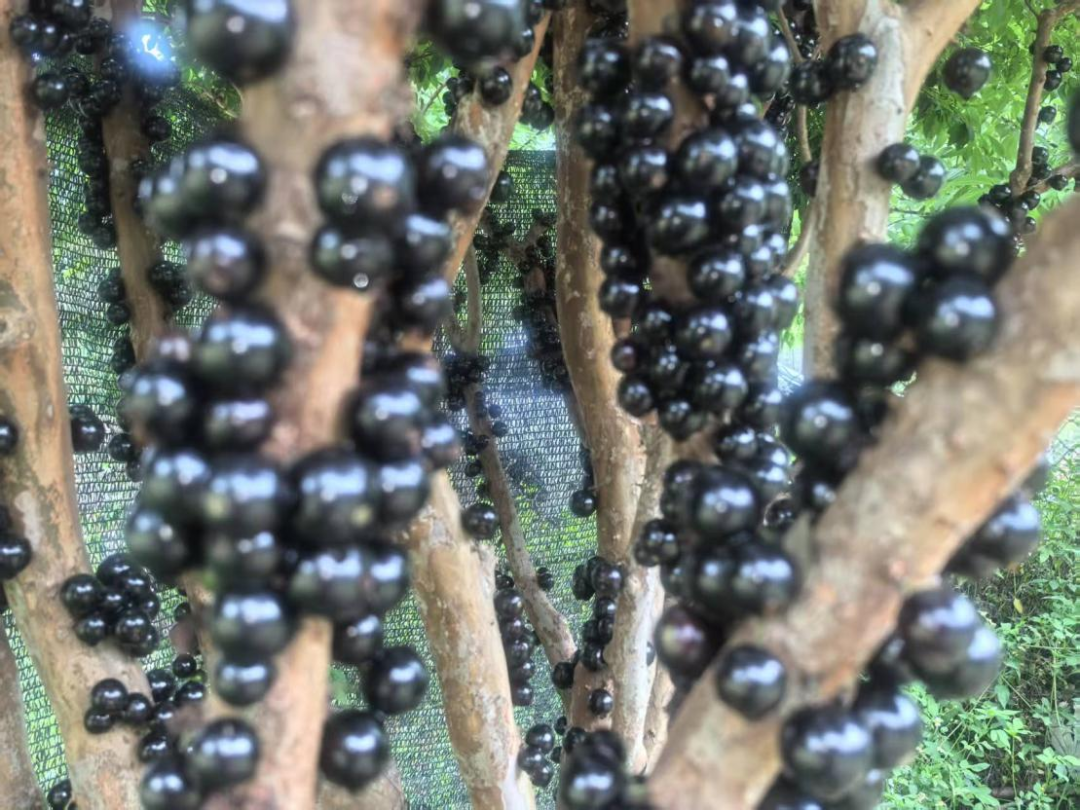 距离村委约300米的树葡萄果园内果香四溢。10亩多地种植了400多棵嘉宝果树。